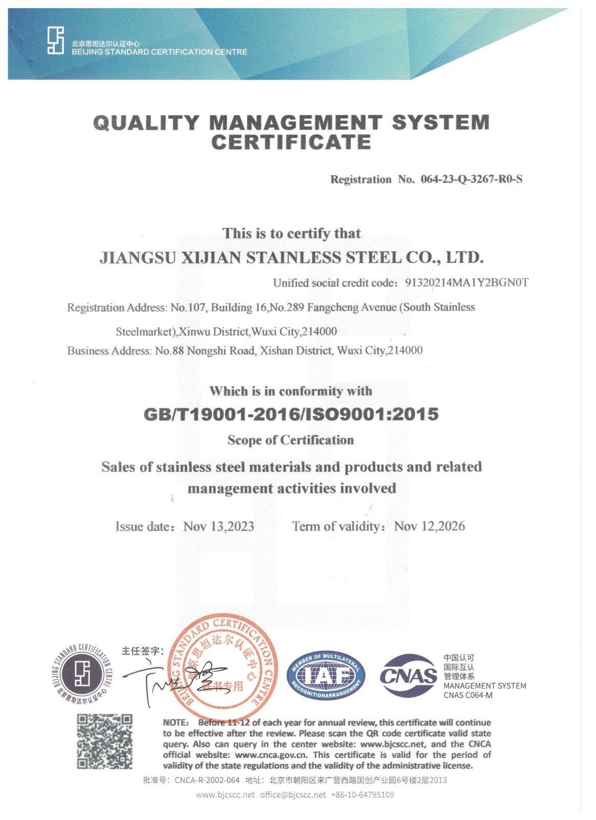 Jiangsu Xijian Stainless Steel Co., Ltd. is located in the beautiful Taihu Lake - Wuxi, is a collection of processing, wholesale, retail as one of the large stainless steel trading company in East China; Is the core supplier of stainless steel plate, hot rolled coil plate, heat resistant plate, container plate, pattern plate and other stainless steel products. The company is mainly engaged in the stainless steel materials of TISCO, Special Steel, Shanghai Baosteel, POSCO steel mills in China, and has maintained long-term friendly cooperative relations with major steel mills. In order to better serve our customers, our company has more than 8,000 square meters of storage, 201, 304,430,321,316L, 310S, 2205 and other hot rolling inventory of more than 5,000 tons. Our company also provides leveling, trimming, slitting, surface treatment, cutting, bending and other one-stop processing services. Since its establishment, the company has been adhering to the "full resources, fast delivery, considerate after-sales" business service philosophy, In addition, our company has successfully obtained the import and export right, becoming one of the few enterprises in Wuxi stainless steel industry with independent import and export qualification. Our company has a scientific and sound system, humanized service, professional and strong executive team, to provide a strong guarantee for customer service.